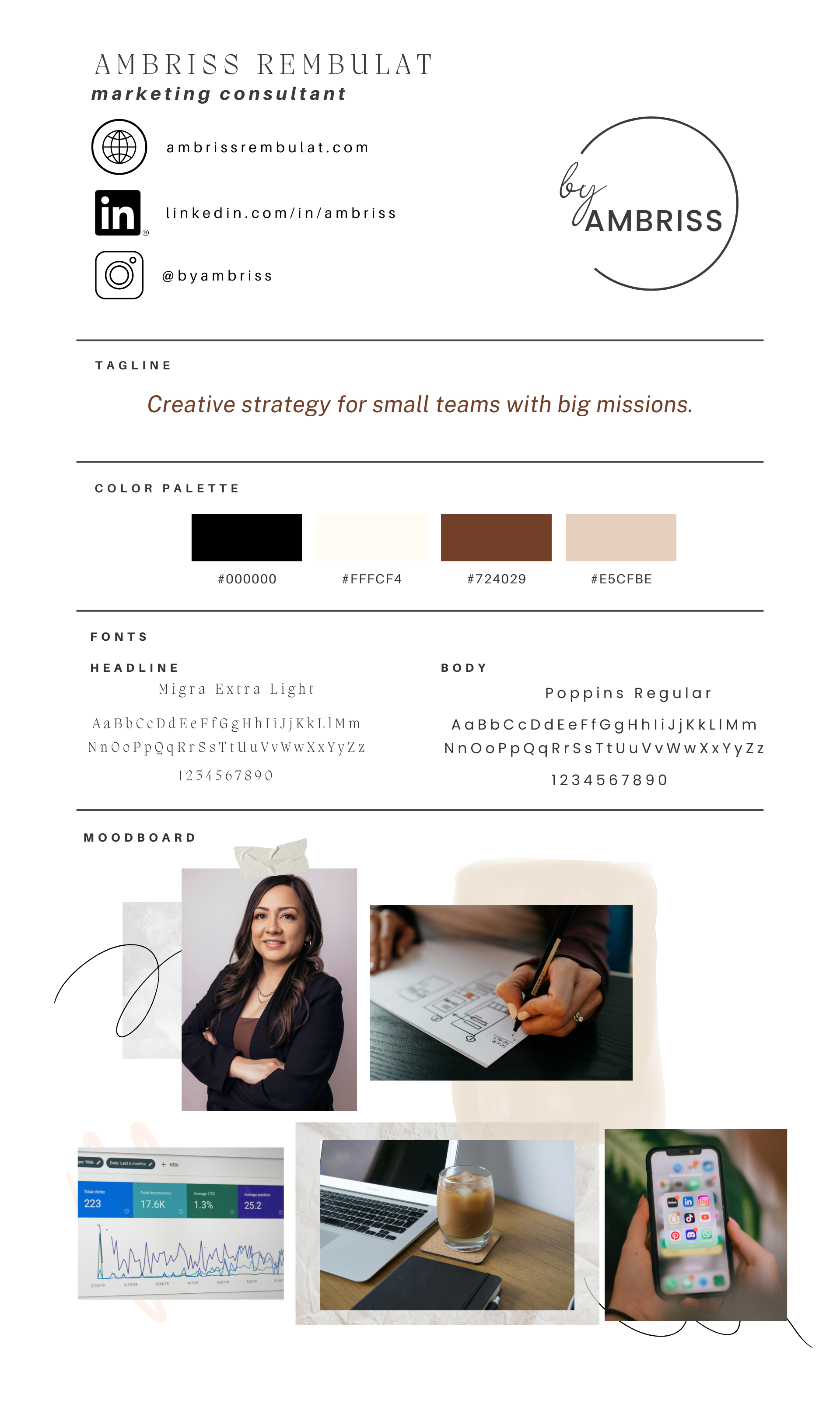 I built my brand and workbook around the work I’m currently doing with small businesses and nonprofits, as well as the direction I want to grow in. I started by reflecting on my existing clients—their goals, challenges, and the impact of our collaborations—and then envisioned the type of clients I’d like to attract in the future. From there, I developed my mission, vision, and brand voice to align with that audience: purpose-driven, creative organizations that value authentic connection and measurable growth.
